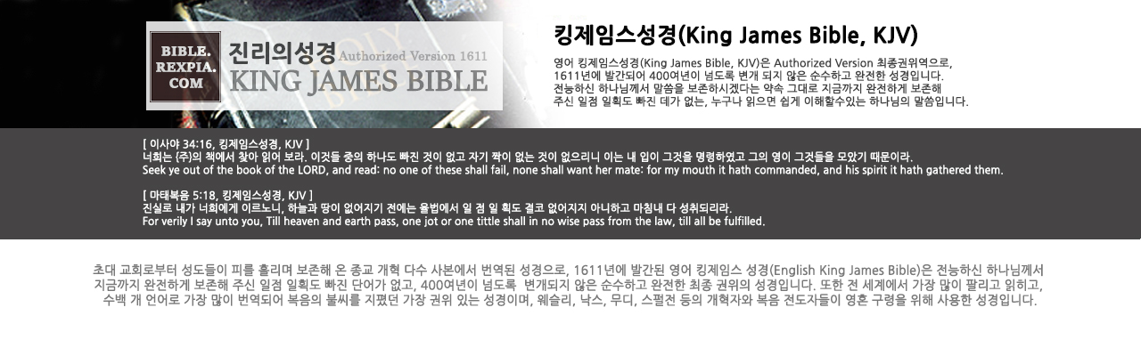 ★이곳에 올리는 성경구절은 영어킹제임스 성경과 영어킹제임스 성경을 한글로 번역해 놓은 킹제임스흠정역(그리스도예수안에 출판) 성경으로 인용하고 있습니다. 한글 표현이나 해석 또는 오번역시, 단어 선택의 한계가 있는 경우에는 최종 권위인 영어 킹제임스성경(KJV1611)을 기준으로 해석하고 있으며, 명확한 뜻의 전달을 위해 킹제임스 성경을 직역해서 사용하며, 킹제임스 성경 직역 버전은 'REX Version'로 명시하고 있습니다.